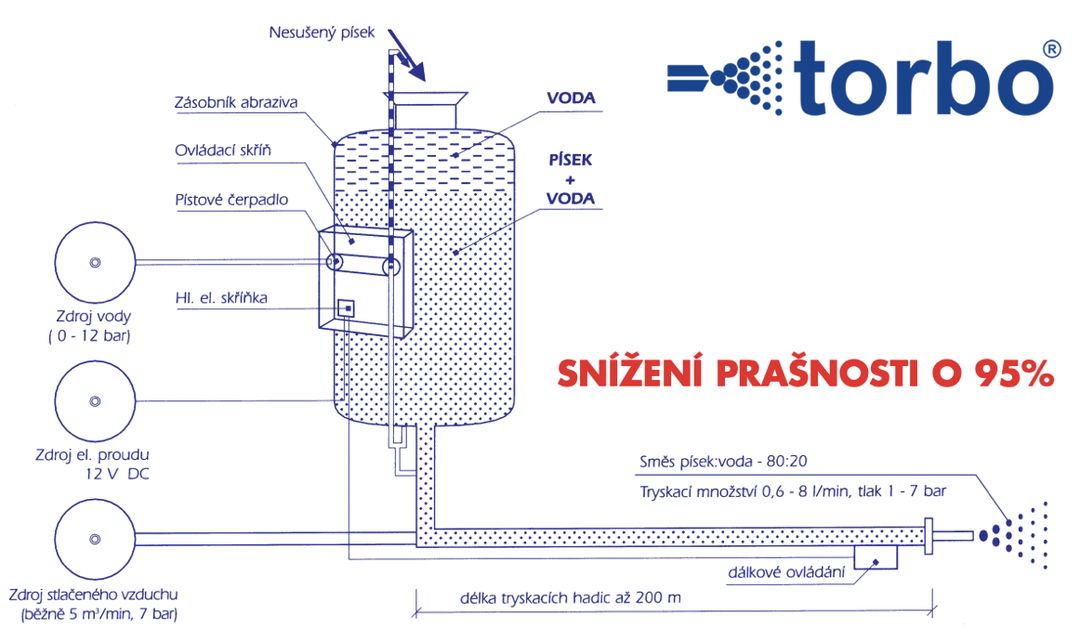 Tryskání a pískování systémem Torbo® je prováděno směsí písku s vodou, která je unášena proti otryskávané ploše proudem stlačeného vzduchu. Abrazivní účinek je dosažen kinetickou energií proudící směsi. Rychlost zrna písku při výkonu kompresoru 10 m3 /min a tlaku 7 bar je cca 300 m/s. Přístroje jsou řízeny 12V stejnosměrným proudem a ovládány pneumaticky. Přístroje jsou vybaveny pístovým čerpadlem se sací výškou 6 m. U všech přístrojů je konstantní nastavení tryskací směsi v poměru 80:20 (písek:voda) a lze jej regulovat až do nastavení změny poměru (písek:voda) ve směsi na 10:90.